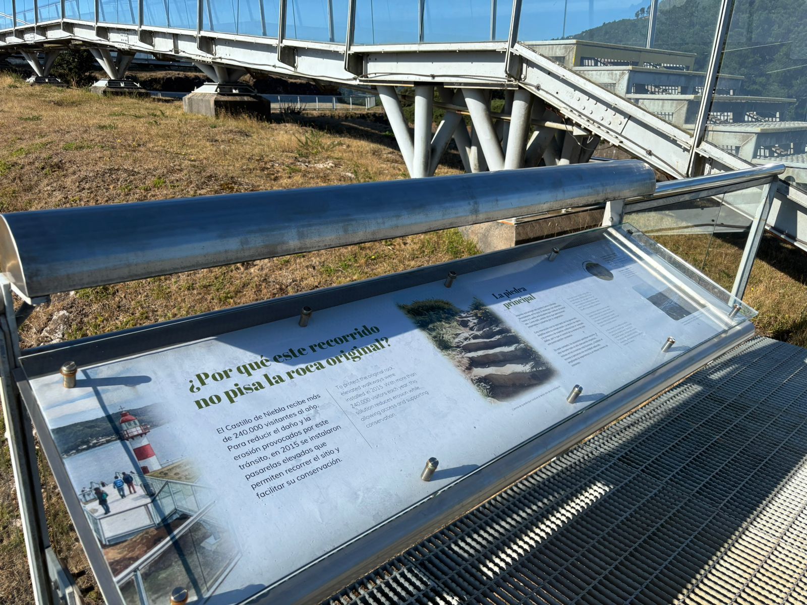 La intervención contempló la renovación de 13 paneles interpretativos, ubicados en puntos estratégicos del recorrido exterior de la fortificación. Estos paneles ofrecen contenidos contextualizados que articulan información histórica, visualización del territorio, aspectos constructivos del castillo y referencias a los usos sociales y culturales del sitio en distintos momentos de su historia. Su disposición responde a la secuencia natural de circulación de los visitantes, facilitando una comprensión progresiva e integrada del Castillo en sus dimensiones militar, social y paisajística. Los contenidos se complementan con un sistema de audioguías mediante códigos QR, que amplía la experiencia interpretativa.